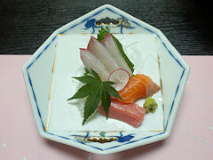 手前左から椀もの。右に刺身である。