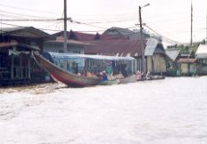 (← 左・すれ違う船におみやげ売りの小さな船が寄ってくる。私たちの乗った船もこのような船でした。右・電柱が川の中に立っています。)