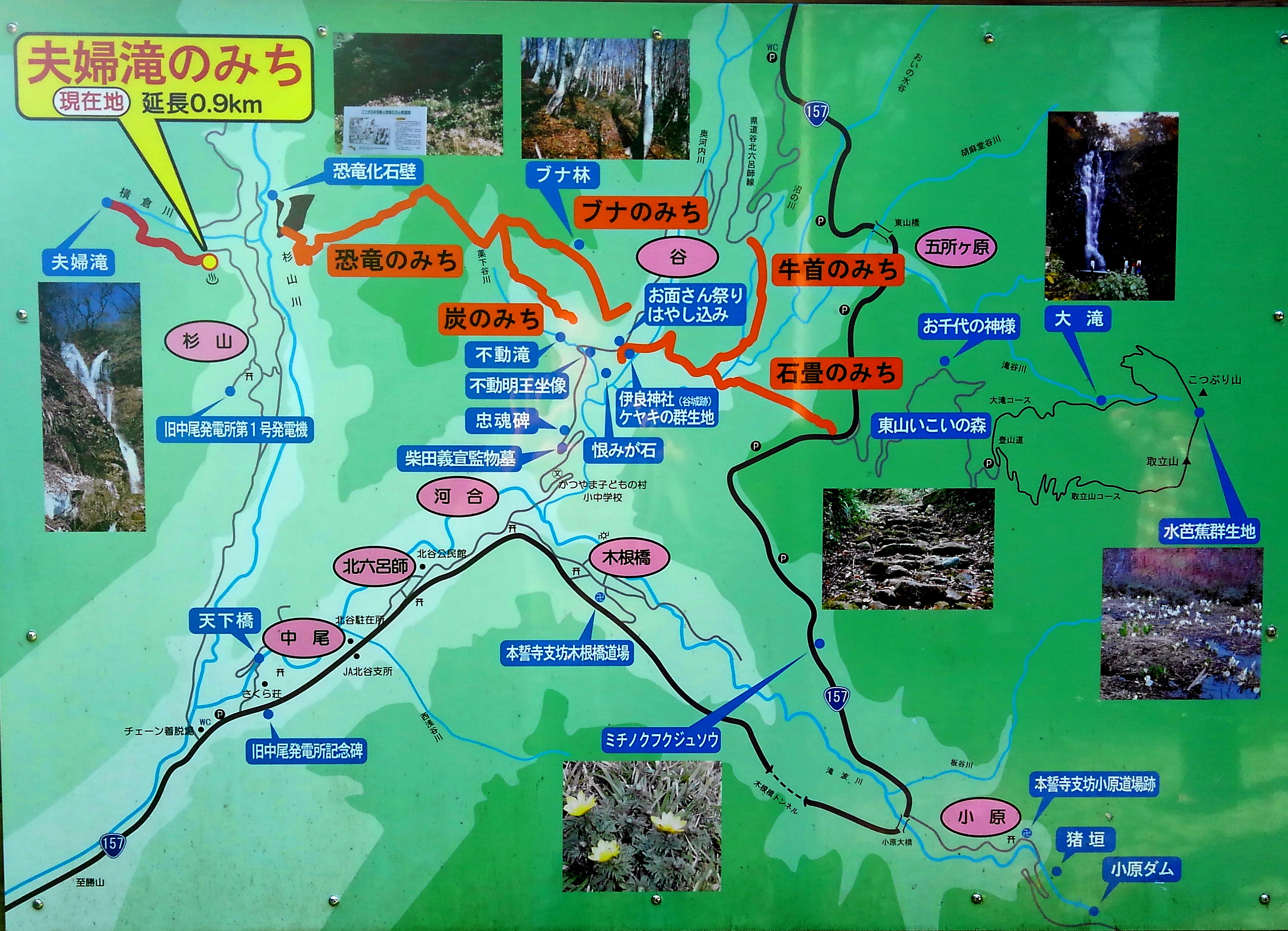 さて,旧の国道157号線(現在は県道谷北六呂師線)を通ったということですが,大型車はすれ違えない細い道。国道は今では少し遠回りですが,2車線のきれいな道に整備されています。ここの工事をしていたのは40数年前のはず。そのときにできかけの新しい国道に入ってみて,まだ先に行けなくて引き返した覚えがあります。