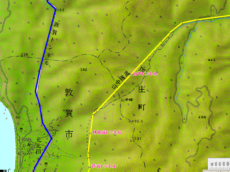 撮影地近辺の地図(黄色→北陸本線旧線,黄緑色→北陸自動車道,赤色→現在の北陸本線(そのうちの桃色部分は北陸トンネル))