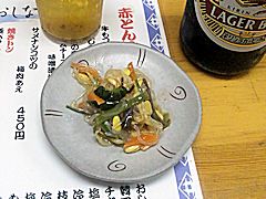 「牛もつ煮込み」が出てくるまで,しばし待ちつつビールを飲むが,先に「付き出しです。どうぞ。」とナムルが小皿で出てくる。「おおっ,ここは付き出しがあるのか。なかなかいいサービスじゃないか。」と思ったのだが,何のことはない,この付き出しお勘定の中に入っているのだった。最後のお勘定から逆算すると,この付き出しは200円。付き出しならこの程度の価格と言うべきか,この少ない量ならもっと安くてもいいと言うべきか。まあ,「こりゃいいサービス」と思った自分の感覚では後者。もうちょっと安くて,100円でもいいんじゃないの,と思ったけどね。