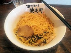 味は途中でちょっと辛くて,こりゃもう少しラー油を少なめに,つまりおすすめは2周だが1周でもよかったかと思ったが,あとの方になると,いい味になった。結局はよくかき混ぜることが大切である。全体としてはそこそこの味。要するに焼きそばのちょっとコクのある醤油味,麺は味わいがあり,美味しめ,って感じだろうか。大盛りだったが,汁なしなので,軽く食べられる。トッピングがかなりいろいろとあり,味の変化を求めて,ネギくらいはちょっと試してみるのもおもしろいかもしれないと思ったのだった。「でらうみゃあ」というほどではないが,「まあうみゃあ」って感じかな。