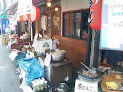 「いよいよビールの時間だ,のどを潤す店はないか。」と歩いていて,目にとまったのが「もつ煮込み」と「自慢の炭火焼き」の文字である。しかも,これらが店頭で売られている。ということで,この店の前で立ち止まり,小休止としたのだった。