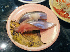 こちら大好き「しめ鯖」140円也(税込み147円也)。いやはや,ここのしめ鯖も美味い。結構身が厚い。しかも適度な締め具合。これで147円だから,これ10皿でも1500円以内で,それだけでも十分満腹で満足するのが「満腹探検隊」隊長である。ちなみに,一人で10皿も食べられない。今回は連れあいと2人で13皿で,そのうちの1皿は生ビール。寿司12皿だが,適当に分け合って,自分は7皿くらい食べたはず。それでも十分満腹になり,満足した。ちなみにこの「しめ鯖」は2皿食べたけど。