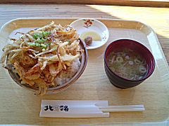 「白海老天うどん」のかき揚げの方は有磯海サービスエリアのものに比べると,かき揚げが少々物足りない。小さめである。しかし,かき揚げ丼は,少々小振りのどんぶりにあふれんばかりのかき揚げであった。
