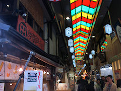 錦市場は公式ウェブサイトでは,商店街振興組合の会員店は123店舗で,魚介,野菜等の生鮮食料品以外の店も多い。金沢の近江町市場は170店舗あまりあり,そのほとんどが生鮮食料品の店である。実際に歩いた感じでも,品揃えでは近江町市場の方がかなり多いと思う。錦市場は歩いてみて楽しかったが,晩ご飯のおかずを調達するよりも,京都のものをいろいろと見て回るところって感じだね。