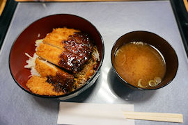 右は名古屋名物「味噌かつ丼」。ビールのお供にもなる。880円也。
