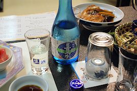 右,途中から日本酒に変える。なにしろ料理がいろいろと出てきてお腹がいっぱいになるのである。こちら冷酒であるが,地元飯田の喜久水酒造の地酒。「しぼりたて本醸造生貯蔵酒 生貯 喜久水」とある。これもなかなかいけたね。300mlと思われるが1本540円也。