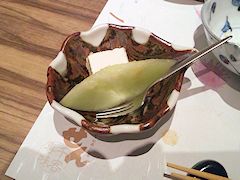 居酒屋と言えば,ちょっと薄汚れたカウンター,目の前のおやじさんが作る料理とおかみさんが入れてくれるコップ酒,にぎやかなおしゃべりと,焼き物の煙,てな感じだったのだが(これって偏見?),ここ「せん」は暗い照明,おしゃれな内装と個室,ちょいと若めの女の子の接客(おまけに無線機付き,ちなみに,男の子もいるにはいる)ということで,居酒屋も変わったものだと思ったものだった。その雰囲気は今も健在。今日は適当に注文する。