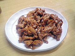 さて,ビールがどんどん進むので,やはりここはお品書きの一番最初にある「焼き鳥」(3本300円)も注文する。その際,もう一品,野菜不足のため「野菜炒め」(500円)も注文する。まずは野菜炒めが出てくるが,これまた美味い。しゃきしゃきでありながら,いい味を出している。