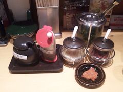 自分は特に何も入れずに,出てきたものをそのまま食べるのだが,人によってはいろいろと入れるために,なんだか調味料らしきものが並んでいる。次回はこってりに何か入れてみようかと思うのであった。