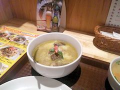 おまけでスープとサラダがついているが,これはタイ風の味ではないようだ。単純な西洋風の味だ。なのでこれには目の前に解説のあった「タイ料理の調味料セット」の中から選んでかけてみるのがよかったのかも知れない。「酢」,「砂糖」,「魚醤」,「粉唐辛子」の4種類である。スープには「魚醤」である「ナムプラー」を入れてみると,面白かったかも知れない。