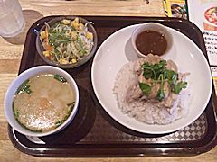 さて,やって来たのはこんな感じ。いつもと違ってサラダとスープが左側に置かれた。あれれ,これって逆なのかも知れない,と思ったが,ご飯のタレは向こう側なので,やはりこれでいいのかと思いつつ,いただく。このタレをご飯の上の鶏肉の上にさーっとかける。そして一口いただくが,実にいい味だ。そんなに辛くはないが,旨みのある味である。そして,いかにもタイらしい香辛料の味と香りである。