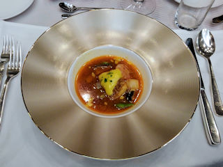 今回は前回と異なり最初に「カリフラワーのムースと甘海老とキャビアのカクテル」というのがあり,つまりは「世界3大珍味」の「キャビア」と「トリュフ」が登場している。で,もう一つの「世界3大珍味」が思い出せない。つまりはこれらを美味しいとは思えない日本人だからである。