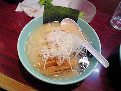 「塩ラーメン」はあっさりした中にもこくがある。とんこつ味ではなく,純粋な鶏がらスープって感じだ。「醤油ラーメン」と違ってしらがネギである。