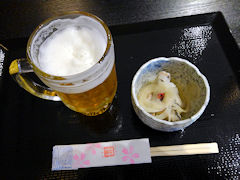 これはビール1杯に日替わりのちょっとしたおつまみ付きである。ビールは400円だから,ちょいおつまみは100円相当。それがこの日はお刺身だった。