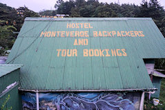 左:道路から見た屋根。屋根には「Hostel Monteverde Backpackers」が書いてあります。