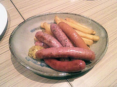 ということで,まずは「ソーセージ盛り合わせ」(1000円也)である。なにしろ基本的には乾きものはあまり好きじゃない。なぜかというと口の中が乾くからである。水分を補給しないと食べられなくなるので,水気のあるものがいい。