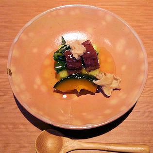 で,いつも女将さんが料理の説明をしてくれるんだけど,4品目くらいから宴会で盛り上がって誰も聞いていない。