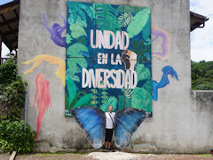 歩いていくと,壁面に大きく「Unidad en la diversidad」とあり,その下にコスタリカで「森の宝石」と称されるの蝶々「モルフォ蝶」のオブジェが。つまりはここに入って蝶々になりなさいということかと,単純に私は蝶々になってきました。一応美しい蝶ですよ。蛾ではありません。