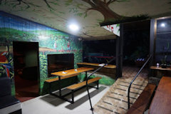 右:入ってすぐの卓球台のある部屋。壁にはここにも「PURA VIDA」が。
